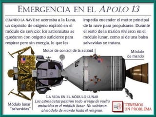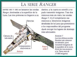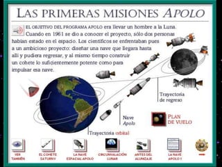 El documento resume las principales misiones del programa Apolo de la NASA para llevar humanos a la Luna entre 1966 y 1972. Incluye detalles sobre los primeros vuelos de prueba sin tripulación, el accidente del Apolo 1, y las misiones tripuladas Apolo 7 a 17, culminando con el exitoso alunizaje del Apolo 11 y las subsiguientes misiones que exploraron la superficie lunar. El programa Apolo logró que 12 astronautas caminaran sobre la Luna y recogieran muestras lunares.