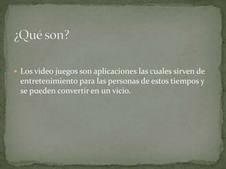 Los videojuegos son aplicaciones de entretenimiento que pueden convertirse en un vicio, interactúan con dispositivos electrónicos como computadoras o teléfonos móviles, y crean diversos conflictos y riesgos para los jugadores y otras personas.