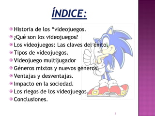 El documento aborda la historia de los videojuegos, desde su invención en 1947 hasta su evolución y éxito en la cultura actual. Se discuten los diferentes tipos de videojuegos, sus beneficios y desventajas, así como su impacto en la sociedad, especialmente en el desarrollo cognitivo y psicomotor de los jóvenes. A pesar de algunos riesgos asociados, como el aislamiento y la exposición a la violencia, los videojuegos son considerados una herramienta de entretenimiento con potencial educativo.