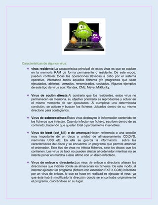 Los virus informáticos son malware que alteran el funcionamiento de las computadoras sin el permiso de los usuarios. Pueden destruir datos o ser molestos. Se ejecutan cuando programas infectados se ejecutan y el código del virus queda residente en la memoria, infectando otros archivos. Existen varios tipos como troyanos, gusanos, bombas lógicas y hoaxes.