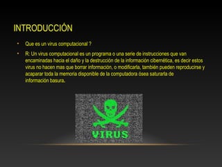 Este documento describe la historia y tipos de virus informáticos, incluyendo los primeros virus como Creeper y sus efectos dañinos, así como los virus más comunes actuales como los de macros y gusanos. También proporciona consejos para combatir los virus como instalar y actualizar software antivirus y escanear archivos descargados.