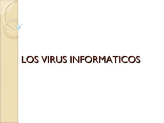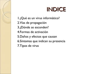 Este documento describe los virus informáticos, incluyendo su definición como malware que altera el funcionamiento de la computadora sin permiso, sus métodos de propagación a través de dispositivos de almacenamiento y correo electrónico, los daños que causan como la modificación y eliminación de archivos, y los síntomas que indican su presencia como la ralentización del sistema. También explica diferentes tipos de virus como troyanos, gusanos, virus de macros, virus de sobreescritura y más.