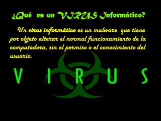 Este documento describe los principales tipos de virus informáticos, como los virus de programa, los virus de sector de arranque y los virus de macro. Explica que un virus es un malware que infecta computadoras sin el permiso del usuario y puede dañar datos o interrumpir el funcionamiento normal del sistema. También define troyanos y gusanos, y describe cómo estos se propagan comúnmente a través de archivos adjuntos de correo electrónico y pueden transmitirse rápidamente entre sistemas. Además, recomienda mantener software antivirus, antis