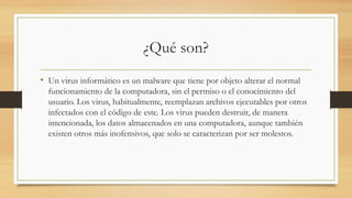 Los virus informáticos son programas maliciosos que alteran el funcionamiento de una computadora sin el permiso del usuario, infectando archivos ejecutables para replicarse. Un virus típicamente se ejecuta cuando un programa infectado se ejecuta, permitiendo que el código del virus resida en la memoria RAM y luego infecte otros archivos ejecutables. Los virus tienen como objetivo propagarse a través del software y pueden tener cargas dañinas que van desde bromas hasta daños serios en sistemas o redes. El primer virus reconocido atacó una computadora IBM en 1972