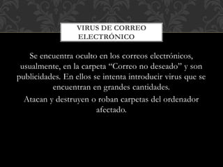 El documento describe diferentes tipos de virus informáticos como virus de correo electrónico, troyanos, spyware, malware, virus de ingeniería social, phishing, estafas nigerianas, virus de internet y redes sociales, spam, jokes y hoax. También explica qué es un antivirus y cómo este puede ayudar a proteger los dispositivos de los virus. La conclusión recomienda navegar con antivirus actualizados, tener antivirus en todos los dispositivos, no creer en publicidades engañosas y estar informado sobre los diferentes tipos de virus.