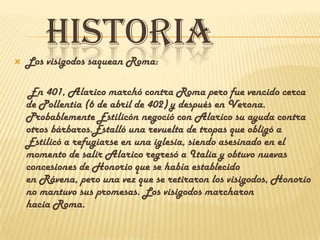 Los visigodos saquearon Roma en el año 410 después de invadir Italia. Eran una rama de los pueblos godos que habían derrotado a los romanos en la batalla de Adrianópolis en 378. Se establecieron en el sur de la Galia y después de ser derrotados en la batalla de Vouillé en 507, pasaron a establecerse en Hispania hasta ser derrotados por los árabes en la batalla de Guadalete en 711.