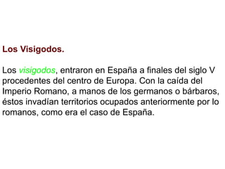 Los visigodos entraron en España a finales del siglo V desde Europa central y expulsaron a los vándalos y alanos con la ayuda de los romanos. Gobernaron la península ibérica manteniendo la división romana en provincias llamadas ducados y condados, aunque compartieron el poder con los suevos durante 80 años. Uno de sus reyes más importantes fue Leovigildo, que trasladó la capital a Toledo y derrotó a los suevos, tratando de unificar a visigodos y hispano-romanos.
