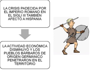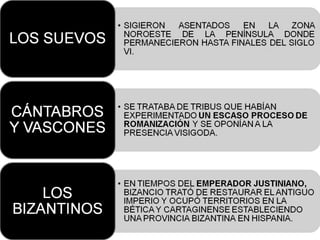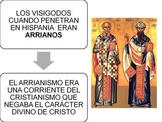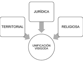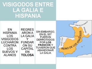 El documento describe la historia del reino visigodo en la Península Ibérica desde el siglo V hasta el VIII. Los visigodos establecieron un reino unificado en Toledo y progresivamente dominaron todos los territorios peninsulares. Aunque inicialmente no controlaban toda la península, otros pueblos gobernaron algunas regiones. Los visigodos adoptaron la cultura hispanorromana y la religión católica, unificando jurídica y religiosamente a la población. Sin embargo, conflictos internos debilitaron el reino
