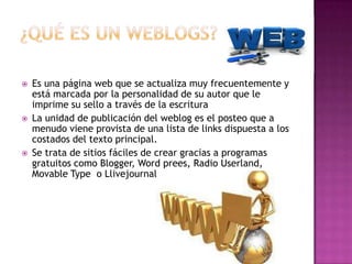 El documento describe la evolución de los blogs y su popularidad creciente. Señala que los blogs sirven para filtrar y compartir información de forma personal, y que su alma son las personalidades y estilos de sus autores. La primera encuesta sobre blogs y lectores reveló que la mayoría utiliza la herramienta Blogger de forma gratuita y consulta blogs diariamente desde casa para descubrir nuevos enlaces e información.