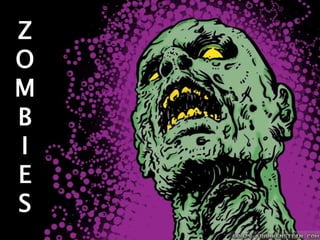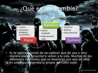 Este documento describe qué es un zombie. Un zombie es la representación de un cadáver que ha resucitado de alguna manera. Puede resucitar debido a factores biológicos, genéticos, químicos o por la intervención de hongos o soluciones salinas. Aunque tradicionalmente se cree que un cadáver no puede volver a la vida, el documento analiza algunas investigaciones gubernamentales sobre resucitar animales.