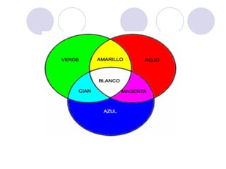 El documento describe los significados y efectos de los colores. Explica que el blanco representa pureza, el amarillo representa felicidad y energía, y el rojo representa pasión y amor. También describe los colores primarios (rojo, verde y azul), secundarios (naranja, verde y violeta) y terciarios. Finalmente, explica que los colores primarios aditivos son rojo, verde y azul y los primarios sustractivos son magenta, cian y amarillo.