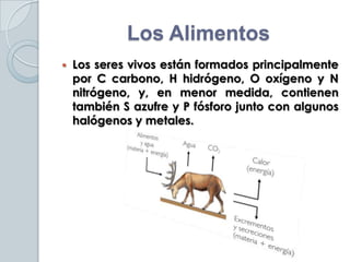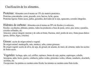 Este documento describe los principales componentes de los alimentos y su clasificación. Explica que los alimentos están compuestos principalmente por carbono, hidrógeno, oxígeno, nitrógeno, azufre y fósforo. Además, clasifica los nutrientes en macronutrientes (proteínas, lípidos, carbohidratos), que se necesitan en mayor cantidad, y micronutrientes (vitaminas y minerales), que se requieren en menores cantidades. Finalmente, detalla los diferentes tipos de sales minerales presentes en los alimentos