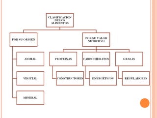 Este documento describe los diferentes tipos de alimentos y sus funciones. Los alimentos se dividen en alimentos de origen animal, vegetal y mineral. Los alimentos cumplen funciones como recuperar pérdidas del organismo, mantener la temperatura corporal, formar nuevos tejidos y aportar energía. Algunos alimentos importantes son las proteínas, hidratos de carbono, grasas, vitaminas y minerales, los cuales cumplen funciones específicas como el crecimiento, producción de energía y regulación del organismo.