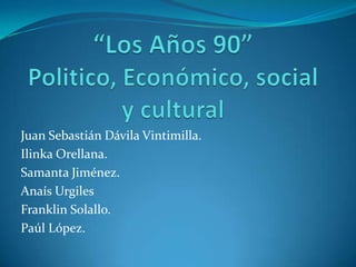 El documento resume los principales eventos políticos, económicos, culturales y sociales de Ecuador y el mundo durante la década de 1990. Políticamente, destaca la caída del Muro de Berlín y la disolución de la Unión Soviética, así como el nacimiento de la Unión Europea. En América Latina se formó el Mercosur y México se unió al NAFTA. Culturalmente, surgieron nuevas tendencias musicales como el pop electrónico y el grunge liderado por bandas como Nirvana. En lo deportivo, Ale