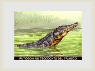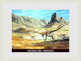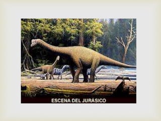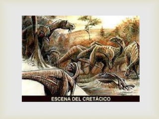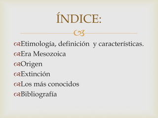Este documento resume la etimología, definición, características, origen, extinción y algunos de los dinosaurios más conocidos. Los dinosaurios surgieron hace 230 millones de años durante el período Triásico y dominaron los ecosistemas terrestres durante 160 millones de años hasta su extinción hace 65 millones de años, posiblemente debido al impacto de un asteroide.