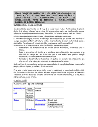 Este documento trata sobre los principios inmediatos de los hidratos de carbono, específicamente sobre la clasificación, tipos y propiedades de los monosacáridos, oligosacáridos y polisacáridos. Explica la importancia biológica de los glúcidos como fuente de energía y para dar estructura, e introduce los conceptos de isomería, ciclación y enlaces entre monosacáridos para formar disacáridos y polisacáridos. También menciona ejemplos importantes como la gluc