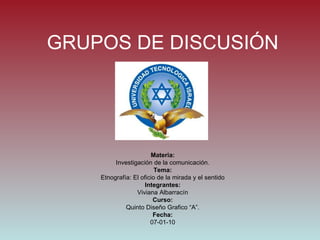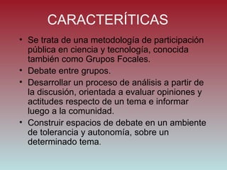 El documento describe los grupos de discusión, una metodología de investigación participativa utilizada para evaluar opiniones y actitudes sobre un tema determinado. Los grupos de discusión involucran pequeños grupos de entre 5 a 10 personas moderadas por un coordinador. El objetivo es generar un debate heterogéneo pero también homogéneo para analizar las perspectivas de diferentes actores sociales sobre el tema en cuestión y así informar a la comunidad.