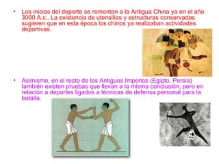 Los inicios del deporte se remontan a la antigua China en el 3000 A.C., donde se han encontrado evidencias de actividades deportivas. Los antiguos imperios de Egipto y Persia también practicaban deportes relacionados a la defensa personal. Sin embargo, los griegos son reconocidos por formalizar los deportes e inventar los Juegos Olímpicos en el 776 A.C. en Olimpia, Grecia. Desde entonces, los deportes se han ido perfeccionando y organizando hasta convertirse hoy en día en un elemento social indispensable que genera pasión