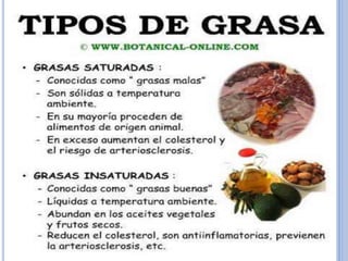 Los lípidos proporcionan energía al cuerpo y son esenciales para su correcto funcionamiento. Forman parte de las membranas celulares, transportan vitaminas liposolubles y almacenan grandes cantidades de energía. Cumplen funciones estructurales, de reserva energética, reguladora, transportadora y biocatalizadora. Una deficiencia de lípidos puede causar problemas en la formación y funcionamiento de células.