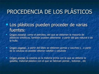El documento describe las diferentes fuentes y propiedades de los plásticos. Los plásticos pueden proceder de fuentes minerales como el petróleo, vegetales como el látex o animales como la caseína. Poseen propiedades físicas como baja densidad y punto de fusión, y mecánicas como blandura y moldeabilidad. Se clasifican en termoplásticos y termoestables. Existen procesos como inyección, soplado y extrusión para darles forma. El reciclaje mecánico y químic