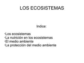 El documento describe los ecosistemas, la nutrición dentro de los ecosistemas, el medio ambiente y la importancia de proteger el medio ambiente. Explica que un ecosistema está formado por seres vivos y su entorno físico, y que la biosfera es el mayor ecosistema formado por la Tierra y los seres vivos. También describe las cadenas alimenticias dentro de los ecosistemas, con plantas como productores y herbívoros y carnívoros como consumidores. Finalmente enfatiza que todos los ciudadanos deben