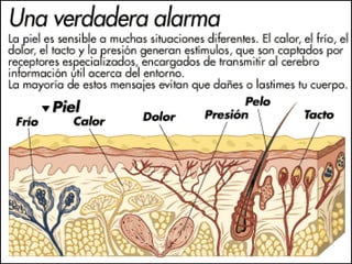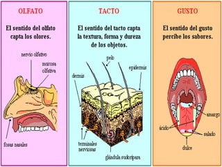 El documento describe los cinco sentidos humanos (vista, oído, olfato, gusto y tacto) y sus órganos correspondientes. Explica que la vista se percibe a través de los ojos, el oído a través de los oídos, el olfato a través de la nariz, el gusto a través de la lengua y el tacto a través de la piel. También proporciona detalles adicionales sobre las partes internas y funciones de los órganos de los sentidos como los ojos, los oídos