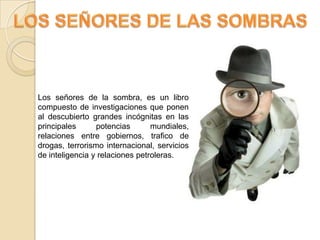 Este documento resume las principales ideas de un libro sobre las grandes incógnitas en relaciones internacionales, como el tráfico de drogas y armas, y cómo estos afectan la economía mundial. Explica que el petróleo y las drogas son los dos ejes del comercio mundial y que existen redes secretas que controlan este comercio ilegal y están vinculadas a gobiernos y servicios de inteligencia. Finalmente, señala que es difícil acabar con este mundo paralelo debido a la dependencia de la economía mundial de estos
