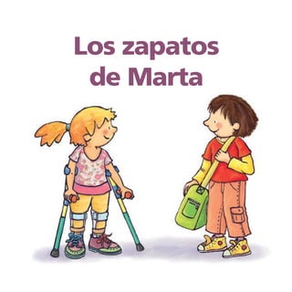 Este documento presenta un resumen de un libro infantil titulado "Los zapatos de Marta". Narra la historia de Lucas, quien invita a su mejor amigo Nico a pasar el fin de semana en su casa. Allí, Nico conoce a la hermana de Lucas, Marta, quien nació con espina bífida y usa zapatos especiales y muletas para caminar. El grupo pasa el día en la piscina, donde Nico aprende más sobre la condición médica de Marta.