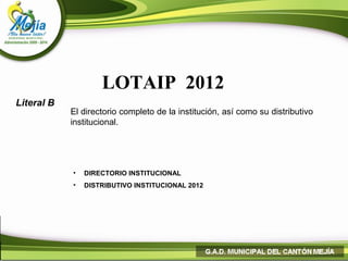 Este documento contiene la información requerida por la Ley de Transparencia y Acceso a la Información Pública (LOTAIP) para el Gobierno Autónomo Descentralizado Municipal de Mejía en 2012. Incluye la estructura organizacional, metas y objetivos, directorio institucional, remuneraciones, contratos colectivos, y detalles completos sobre el presupuesto anual de 2012 como ingresos, gastos, y destinatarios de recursos públicos.