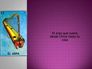 Este documento contiene una serie de frases cortas y aparentemente sin conexión que describen objetos, animales y situaciones de la vida cotidiana de manera ingeniosa y en ocasiones jocosa. Algunas frases hacen referencia a instrumentos musicales como el arpa y las maracas, actividades como la pesca y la cosecha, y comportamientos humanos como la embriaguez y el robo. La mayoría terminan con un giro inesperado que juega con el doble sentido de las palabras.