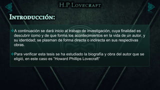 El documento resume la investigación sobre cómo la vida y la identidad de H.P. Lovecraft se reflejan en sus obras. Lovecraft era un escritor estadounidense de terror cuya obra innovó con una mitología propia que exploraba los terrores cósmicos. Su vida estuvo marcada por problemas familiares y económicos que influyeron en sus temáticas recurrentes como la locura y la imposibilidad de escapar de fuerzas mayores.