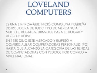 Loveland Computers comenzó como una pequeña distribuidora y ahora es una de las principales tiendas de computadoras por correo en los Estados Unidos. Loveland se centra en satisfacer las necesidades específicas de cada cliente ensamblando las computadoras en sus propias instalaciones a partir de piezas fabricadas por otros. Loveland registra ventas trimestrales de $10 millones con ganancias del 6% de las ventas gracias a su enfoque en la satisfacción del cliente.