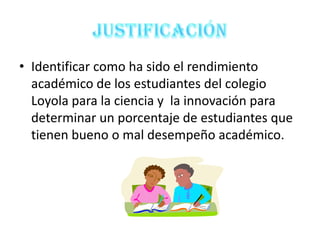 El resumen analiza los resultados de una encuesta realizada a 71 estudiantes del Colegio Loyola para la Ciencia y la Innovación sobre su rendimiento académico. La mayoría de estudiantes tenían buen rendimiento antes de ingresar, pero ahora su desempeño es más alto. La asignatura más difícil es Inglés. La mayoría no tiene otras responsabilidades fuera del estudio y pocos han reprobado años, principalmente por descuidar sus estudios.