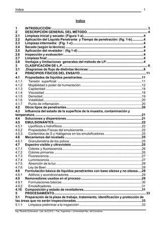 Este documento describe el método de ensayo no destructivo de líquidos penetrantes. Explica el proceso general que incluye la limpieza, aplicación del líquido penetrante y tiempo de penetración, limpieza intermedia, secado, aplicación del revelador, inspección y evaluación. También cubre los principios físicos involucrados como las propiedades de los líquidos penetrantes, mecanismos del revelado, espectro visible y ultravioleta, y formulaciones básicas. Finalmente, discute equipamiento, normas de segur