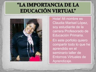 El documento presenta los trabajos realizados por Claudia Marisel López en el seminario taller de Entornos Virtuales de Aprendizaje. Creó un mapa conceptual sobre EVA usando Cmap Tools, un blog educativo llamado "Hermanas López" con su hermana, y una webquest sobre la presidencia de Hipólito Yrigoyen para compartir con sus compañeros. La asignatura le permitió aprender sobre nuevas tecnologías de la información y la comunicación y las herramientas disponibles para trabajar en el aula.