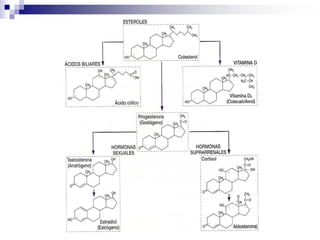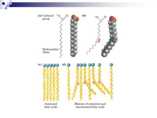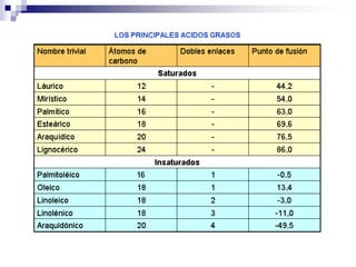 Los lípidos son biomoléculas formadas principalmente por carbono, hidrógeno y oxígeno. Se clasifican en lípidos saponificables como los acilglicéridos (grasas y ceras) y fosfoglicéridos, y lípidos insaponificables como los esteroides. Los ácidos grasos son componentes de otros lípidos y pueden ser saturados o insaturados. Cumplen funciones de almacenamiento energético, protección y como componentes estructurales de membranas celulares.