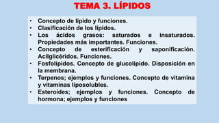 Este documento resume los principales tipos de lípidos, incluyendo ácidos grasos, triglicéridos, fosfolípidos, esteroides y terpenos. Explica sus funciones estructurales y energéticas, así como su papel en las membranas celulares y en procesos como la inflamación. También analiza las propiedades del colesterol y su relación con la salud cardiovascular.