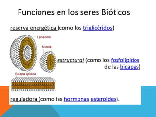 Los lípidos son biomoléculas diversas que cumplen funciones estructurales y de reserva en los organismos. Muchos lípidos tienen una región hidrófoba y otra hidrófila, lo que les permite formar bicapas lipídicas que delimitan las membranas celulares. Dentro de los lípidos se encuentran los ácidos grasos saturados e insaturados, así como las grasas, que son triglicéridos formados por la unión de ácidos grasos al glicerol. Las grasas pueden ser sólidas o líqu