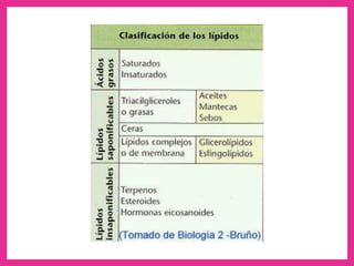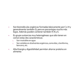 Los lípidos son biomoléculas orgánicas formadas principalmente por carbono e hidrógeno. Son heterogéneas y se caracterizan por ser insolubles en agua pero solubles en disolventes orgánicos. Cumplen funciones estructurales al formar membranas celulares, funciones de almacenamiento de energía, y funciones como hormonas y mensajeros químicos. Dentro de los lípidos se encuentran los triglicéridos, esteroides como el colesterol y las hormonas sexuales y las prostaglandinas