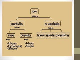 Los lípidos son biomoléculas orgánicas que incluyen principalmente carbono, hidrógeno y oxígeno, actuando como fuente de energía, reservas de agua y componentes estructurales de membranas biológicas. Se clasifican en lípidos saponificables, que se pueden hidrólizar en presencia de un medio básico, y lípidos insaponificables, que no pueden ser saponificados. Las funciones de los lípidos son diversas, abarcando desde la energética hasta la catalítica y la transporte de nutrientes.
