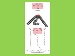 Los lípidos son biomoléculas orgánicas formadas por carbono, hidrógeno y oxígeno. Se clasifican en lípidos simples como ácidos grasos, glicéridos y ceras, y lípidos complejos como fosfolípidos y esfingolípidos. Cumplen funciones estructurales al formar parte de las membranas celulares, y de reserva de energía. Los ácidos grasos son componentes de los lípidos y pueden ser saturados o insaturados, afectando sus propiedades físicas.