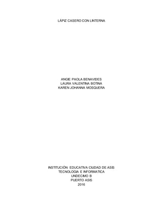 Este documento presenta el diseño y desarrollo de un lápiz con linterna integrada que permite escribir en la oscuridad. El proyecto tiene como objetivo principal permitir que los estudiantes puedan realizar sus tareas escolares en horas de la noche cuando no hay luz. El lápiz se fabrica usando una guadua como estructura principal, una linterna de mechero y baterías. El proceso incluye taladrar la guadua, pegar la linterna con silicona y agregar las baterías. El documento concluye que