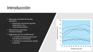 El documento describe el líquido amniótico, incluyendo su producción, cuantificación y alteraciones. El líquido amniótico se produce principalmente por la excreción urinaria fetal y la deglución fetal. Se puede cuantificar de forma directa e indirecta mediante ultrasonido. La oligohidroamnios y la polihidroamnios son alteraciones que se definen y evalúan mediante ultrasonido, y tienen diversas causas y complicaciones potenciales.