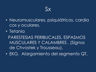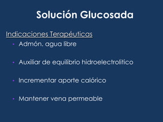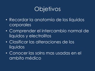 Este documento resume los líquidos y electrolitos corporales, incluyendo el agua total, los compartimentos intracelular y extracelular, y el movimiento del agua entre ellos. Explica las alteraciones de volumen, concentración y composición de los líquidos, así como las causas y tratamientos de la hiponatremia, hipernatremia, hipopotasemia e hiperpotasemia. Finalmente, revisa las soluciones intravenosas más usadas como la solución salina, solución de glucosada, y solución de Ringer lactato.