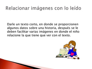 El documento proporciona varias estrategias para desarrollar la comprensión lectora en los niños, como darles textos cortos con imágenes para relacionar, frases desordenadas para ordenar, imágenes para seleccionar según una descripción, frases cortas para ampliar con nuevos elementos, lecturas diarias para hablar sobre lo leído y relacionarlo con experiencias propias, recetas para leer y poner en práctica, e imágenes para que generen una historia.