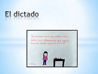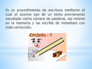 El documento describe el procedimiento de dictado como una técnica de escritura en la que el estudiante escucha y escribe palabras de un texto previamente estudiado para ejercitar la ortografía, legibilidad y velocidad de escritura. El dictado puede usarse con fines de diagnóstico para identificar deficiencias o con fines de enseñanza para impartir conocimientos y corregir errores.