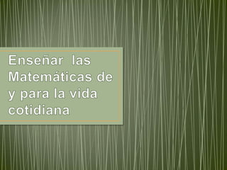 El documento describe cómo los profesores de matemáticas deben ayudar a los estudiantes a relacionar diferentes campos matemáticos y desarrollar habilidades para resolver problemas en contextos de la vida cotidiana donde las matemáticas son importantes. También sugiere que los profesores usen ejemplos de los medios y la actualidad como las quinielas y las loterías, así como situaciones de investigación, para ayudar a los estudiantes a ver las matemáticas en su vida diaria.