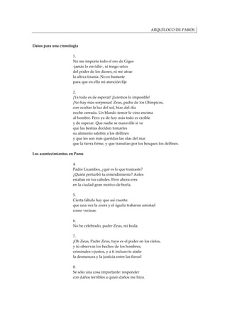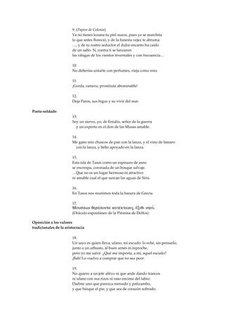Los fragmentos presentan la obra del poeta griego Arquíloco de Paros desde el siglo VII a.C. Abordan temas como la política en la isla de Paros, la vida del poeta como soldado, su oposición a los valores aristocráticos, poemas de amor y vino, y himnos a dioses. El documento provee una cronología de los fragmentos conservados de este poeta lírico arcaico griego conocido por sus sátiras personales.