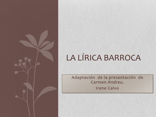 El documento resume la poesía barroca en España. Brevemente: 1) La poesía floreció en el siglo XVII, cultivándose la lírica, épica y poesía dramática. 2) Los conceptismo y culteranismo fueron las tendencias dominantes, rompiendo con la forma renacentista. 3) Autores principales incluyen a Góngora, Quevedo y Lope de Vega, quien escribió sobre amor, mitología y otros temas con variados estilos.