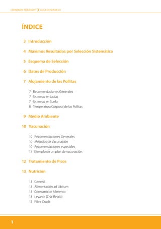 Este documento proporciona una guía de manejo para sistemas de jaulas y alojamiento de ponedoras LOHMANN LSL-CLASSIC. Incluye recomendaciones sobre alojamiento de pollitas, vacunación, nutrición, iluminación y producción esperada. El objetivo es maximizar los resultados a través de la selección sistemática y el manejo adecuado, proporcionando información técnica sobre esta línea de ponedoras.